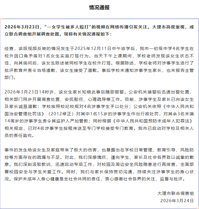2026年3月23日,“一女学生被多东说念主殴打”的视频在汇注传播激发关爱。大理市高度疼爱,设立勾搭拜访组开展拜访治理。现将相关情况通报如下: