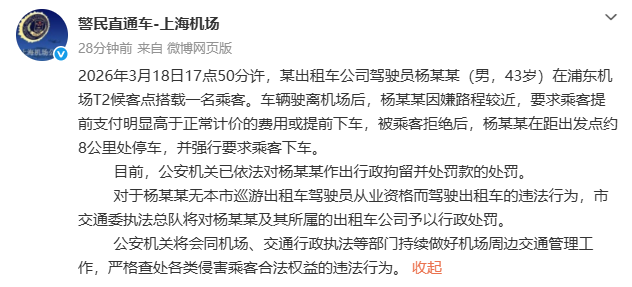 2026年3月18日17点50分许,某出租车公司驾驶员杨某某(男,43岁)在浦东机场T2候客点搭载别称乘客。车辆驶离机场后,杨某某因嫌路程较近,ued中国官网条款乘客提前支付彰着高于闲居计价的用度或提前下车,凯发娱乐(K8)官方网站被乘客休止后,杨某某在距起点约8公里处泊车,并强行条款乘客下车。