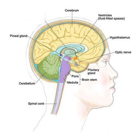 松果体是大脑中央一个松果形式的小腺体,大小约8毫米,分量不到0.2克。它藏在两个大脑半球之间,被脑组织所有这个词包围,位置简直就在头颅的正中心。从剖解学上看,它通过一个细柄与第三脑室后部衔接,像吊挂在脑中的一个小灯笼。