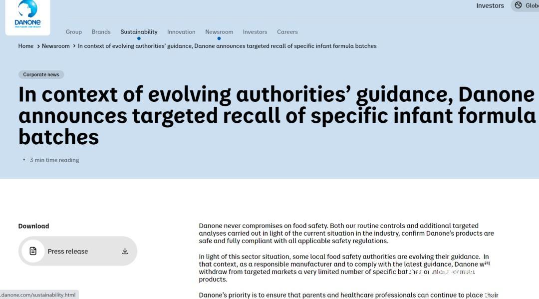 1月26日,达能中国关联认真东谈主向南王人湾财社记者泄露,近日,欧洲主宰部门指暗示见转念触发居品调回,该行为是防患性门径,仅在部分阛阓调回数目极为有限的特定批次婴幼儿配方居品。