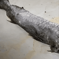 不错看到这只鱼的背部位置有一条细长的生物在鱼皮底下狂放扭动!画面超过惊悚,让东说念主念念起了好多恐怖电影的情节。鱼皮底下究竟是什么?难说念的确是异形?